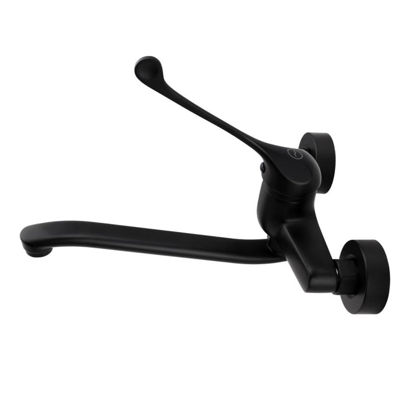 El grifo de cocina de paredAquanello Medic no solo ofrece un aspecto elegante gracias a su acabado en negro, sino también ventajas prácticas, como un caño giratorio y una palanca extralarga para facilitar su uso. El latón de alta calidad y los discos cerámicos garantizan la durabilidad y un funcionamiento suave.