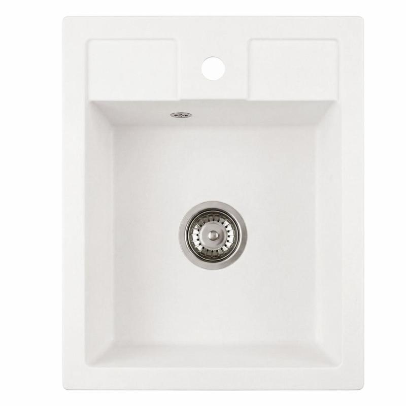 Graniteland Prest Fregadero blanco de granito Tapwing con orificio para grifo sobre encimera 400x500mm con tapón de acero inoxidable 1208971424