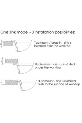 Undermount sinks are mounted below or half way up the level of the worktop. This increases the usable surface of the worktop. This installation method is mainly used for granite, wood and solid plastic worktops. Because the substructure sink unit is placed below the level of the worktop, the worktop is easy to clean.